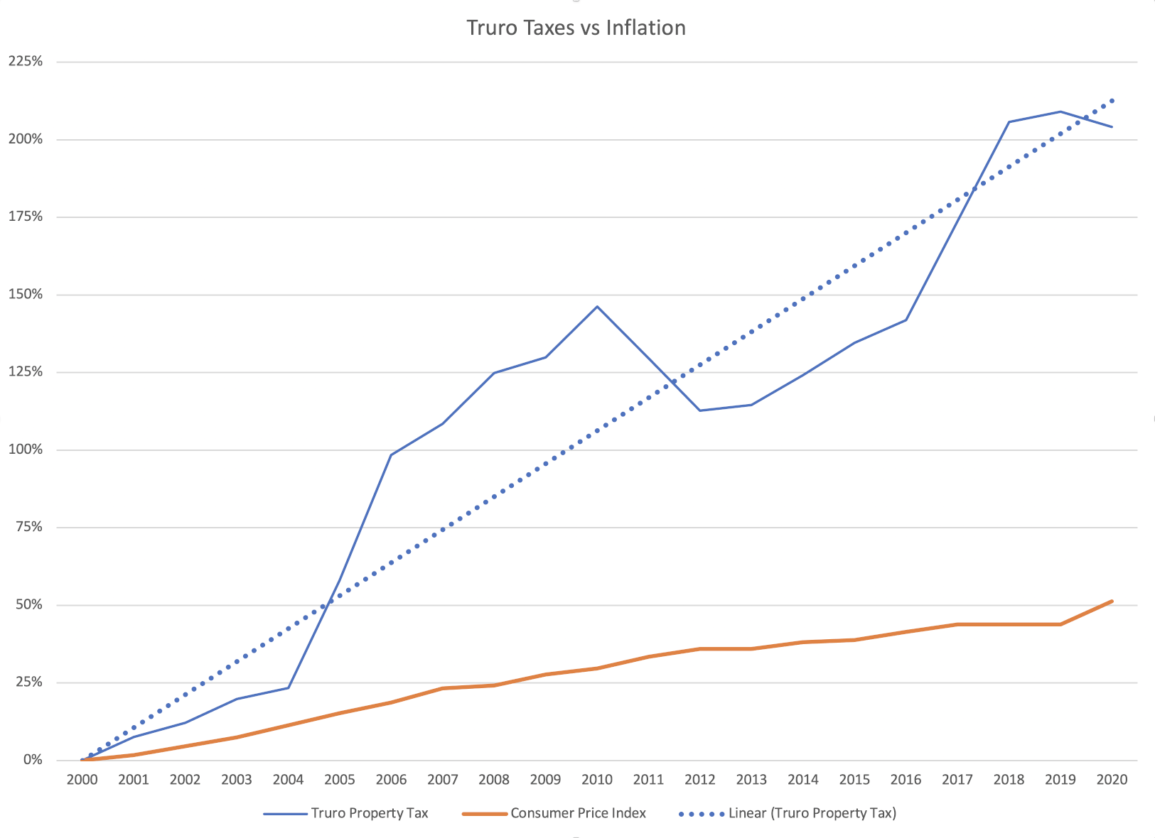 My takeaway is that Truro taxes have over the past two decades been growing four times faster than the rate of inflation (approximately 200% increase vs. a 50% increase). Granted this is just a sample of one property, but the best sample you can take is to see what is happening to your own property taxes .